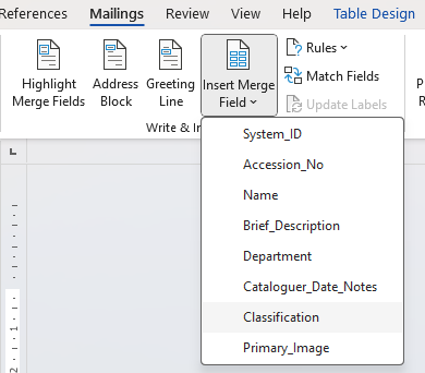 To add a field, click on the Mailings tab, then click Insert Merge Field and select the new field(s).